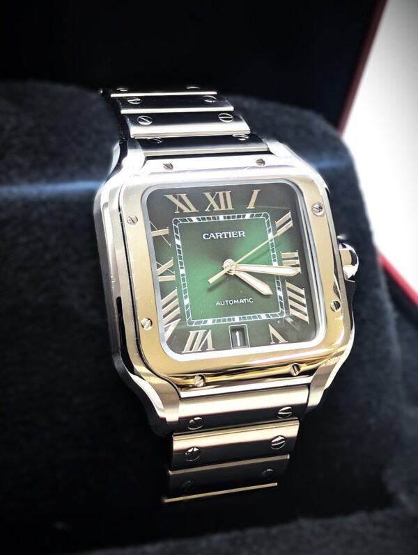 本日ご紹介するのは、世界初の腕時計としての歴史を持ち、洗練されたデザインで世代を超えて愛され続けるカルティエのアイコン、『サントス ドゥ カルティエ』でございます。こちらは特に、光の加減で表情を変える美しいグリーンダイアルが特徴的な逸品。日々の暮らしや特別な瞬間を共に刻んできた、特別な思い入れのあるお品とお伺いしました。